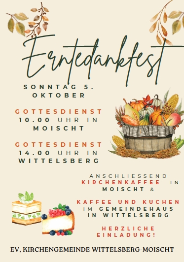 Im Oktober feiern wir Erntedank am Sonntag, 5. Oktober, in der Moischer Kirche um 10.00 Uhr und in der Wittelsberger Kirche um 14.00 Uhr mit anschließendem Beisammensein.