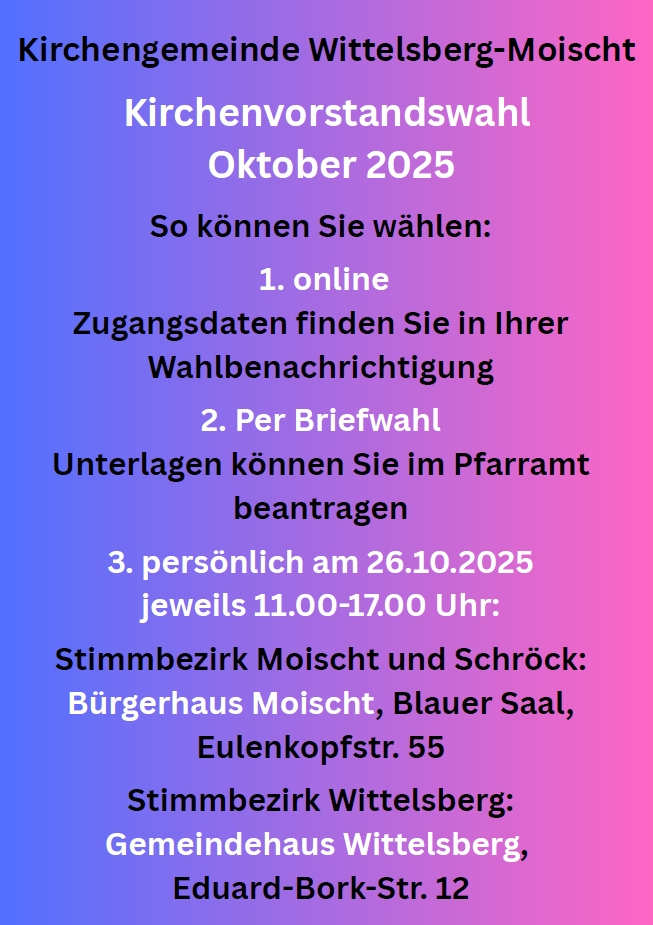 Wir bitten Sie herzlich von Ihrem Wahlrecht Gebrauch zu machen und so auch ein Zeichen der Wertschätzung und Unterstützung kirchlicher Arbeit zu setzen.